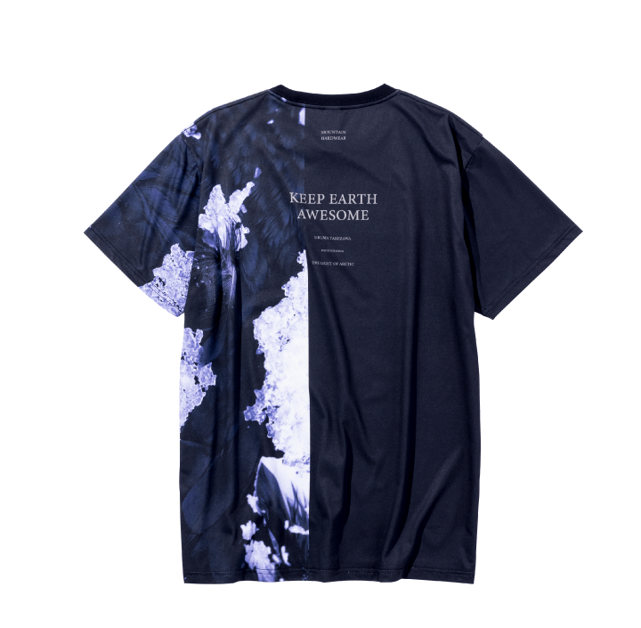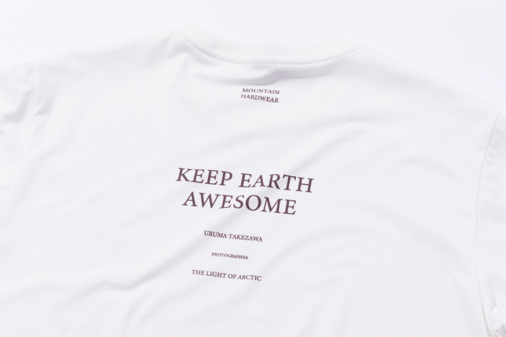 竹沢うるま氏が北極を旅し、レンズに収めた自然の光とその移り変わりを精彩にプリントしたコラボレーションTシャツを製作しました。背面には「KEEP EARTH AWESOME (素晴らしい地球をそのままに)」のメッセージが施されています。