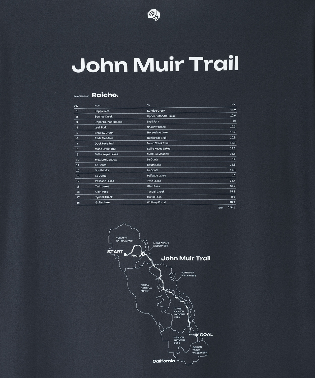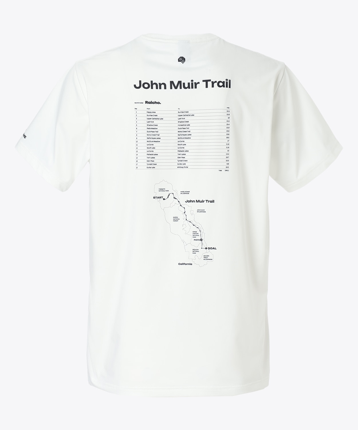4月22日は地球環境の大切さに思いを巡らせ、美しい自然に感謝する日「アースデイ」です。その1日にちなんだ毎年恒例のグラフィックTシャツで、今年は乗鞍をベースにサステナブルな地域づくりに取り組む「Raicho」のメンバーとコラボレーションしました。Raichoのメンバーがジョン・ミューア・トレイルを歩いた際に感じた自然への思いをフォトTシャツとして再現。前面にはトレイルで撮影した写真、背面には彼らが歩いた軌跡や地図をデザインしました。