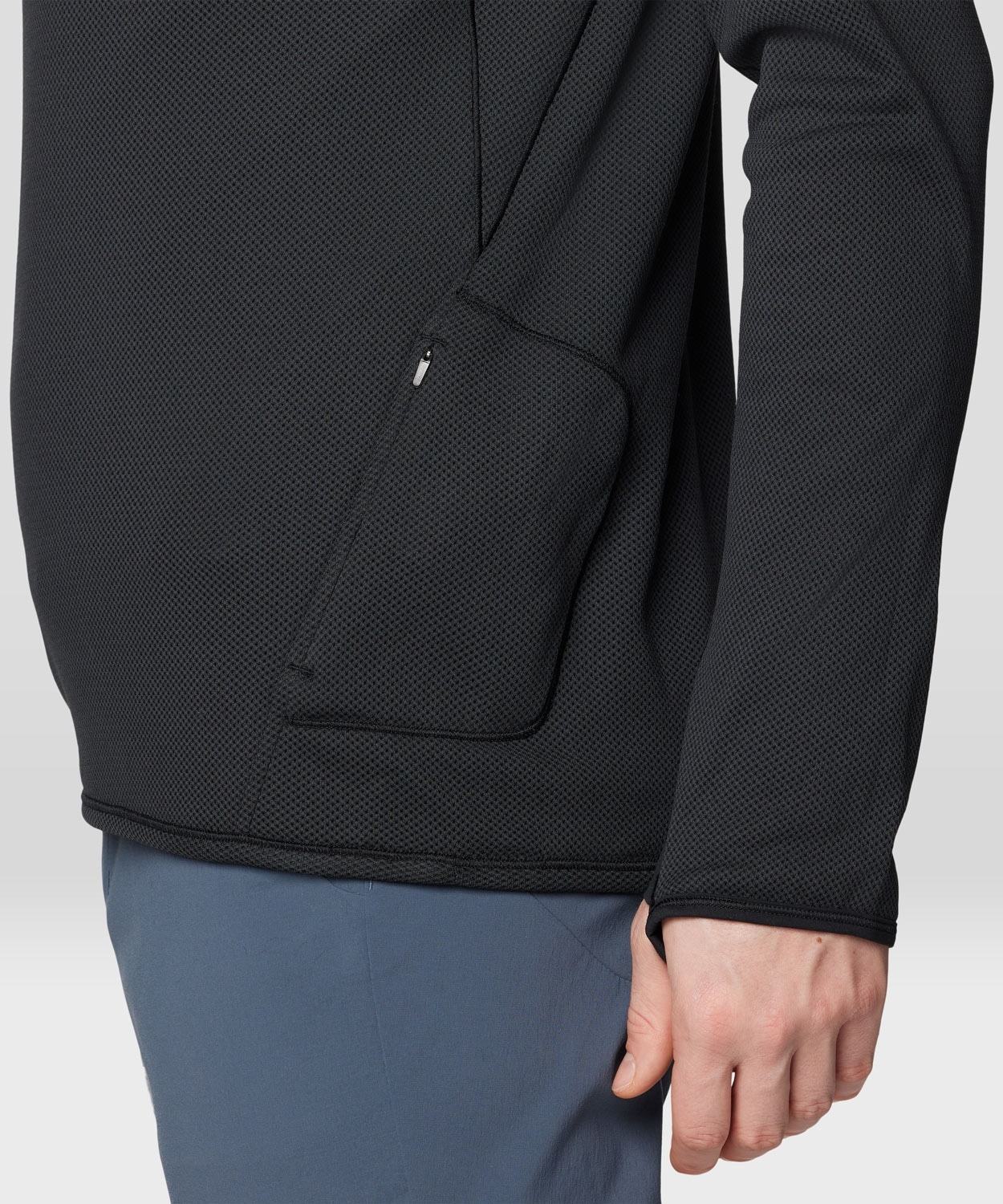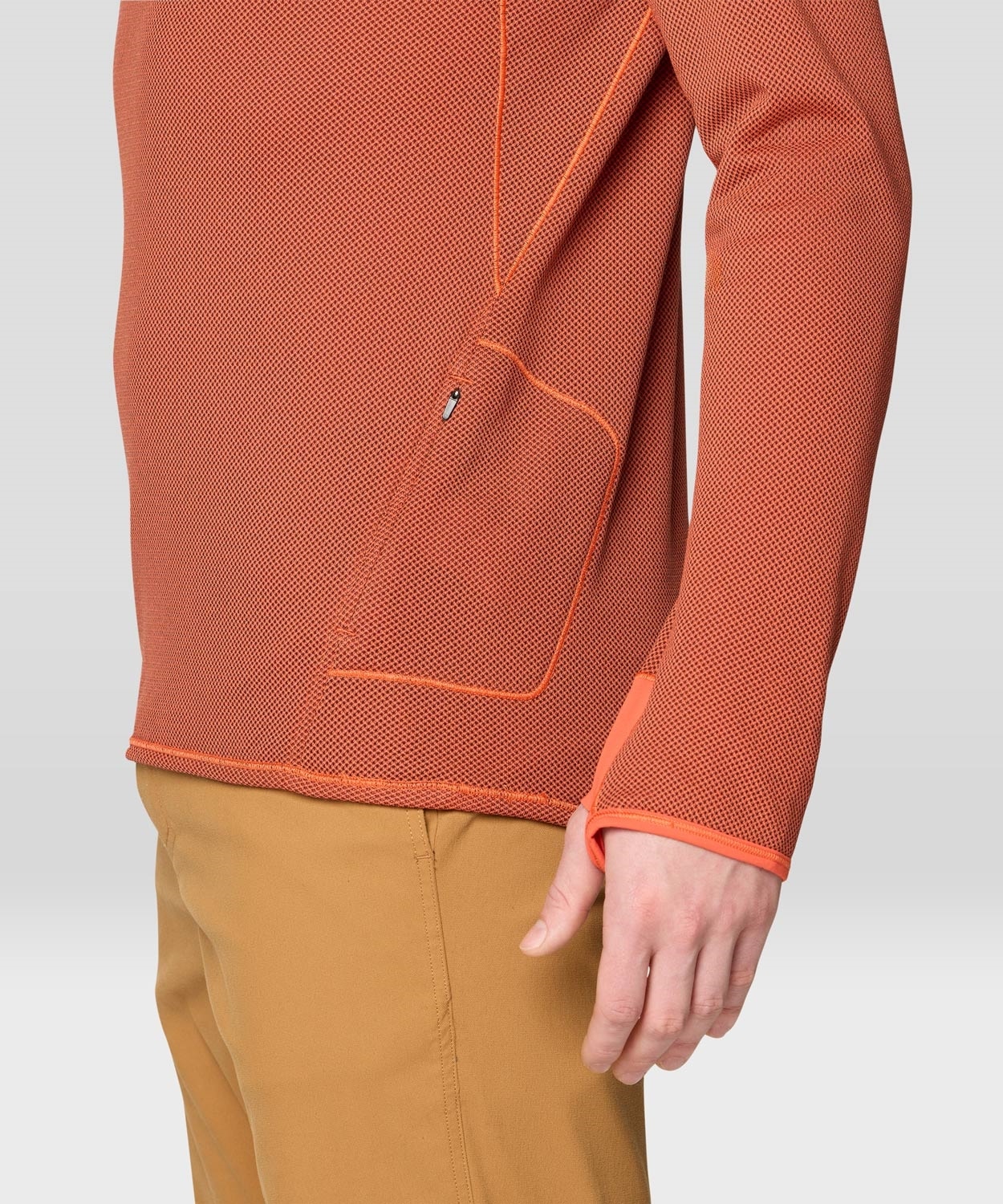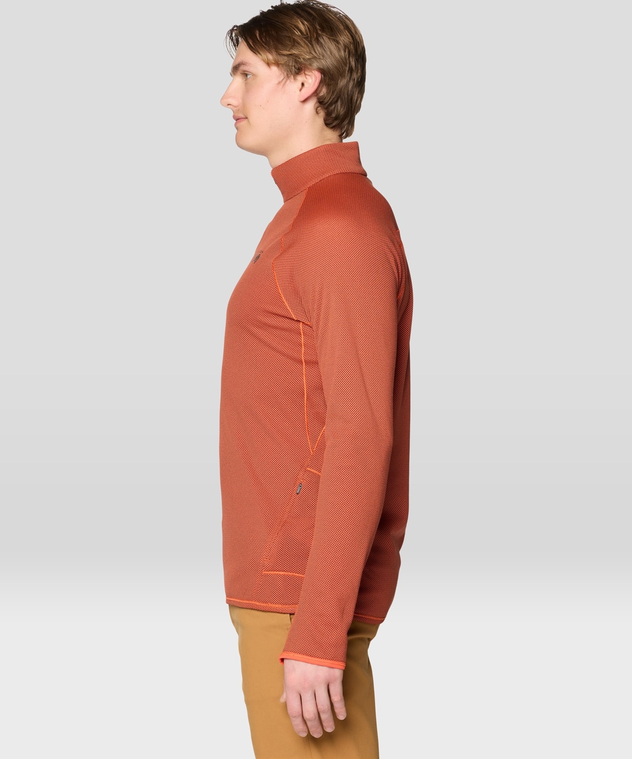 通常の繊維の半分の重さでロフト感と保温性を持たせた特殊構造のポリエステル素材、帝人「オクタ」を使ったロングスリーブ。着脱しやすいハーフジップタイプです。マウンテンハードウェアと帝人の共同開発で、これまでの抗菌効果に加えて消臭効果を新たに追加。前モデルより保温力、耐久性、フィット感を向上させ、秋冬の登山でより使いやすくなっています。登りの際の単体着用や稜線でのミッドレイヤーとしてなど、レイヤリングの可能性を広げる1枚です。