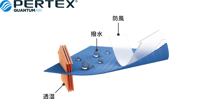 PERTEX®の「カンタムエア」という、高密度に織られた20デニール以下の極細糸で軽量でありながら、引裂き強度と縫い目強度にも優れ、シリアスな状況下でのアクティビティにも耐える画期的なシェル素材を使用しています。通気性と防風性を兼ね備えたストレッチ素材で、有酸素アクティビティ時にウェア内のムレを逃がし、常時着用を可能にします。