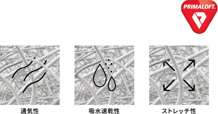 プリマロフトインサレーションは業界最小サイズの微細な繊維を用いることで、ダウンのような優れたソフトさと圧縮性を実現。独自のコーティングを施したファイバーは耐水性にも優れ、濡れた状態でも保温性を保ちます。