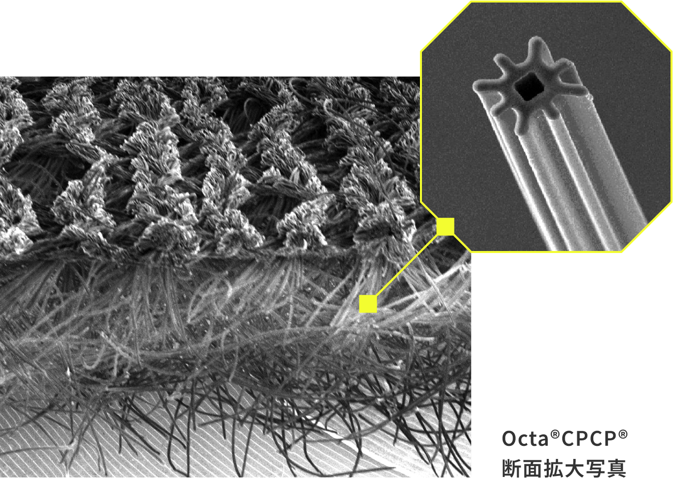 中空糸に8本の突起を放射線状に配列したタコ足型断面ポリエステル繊維Octa®を使用した中綿・裏地の一体化素材。従来の中空糸を超える吸汗速乾・軽量・遮熱/断熱・嵩高など様々な機能を併せ持ちます。
