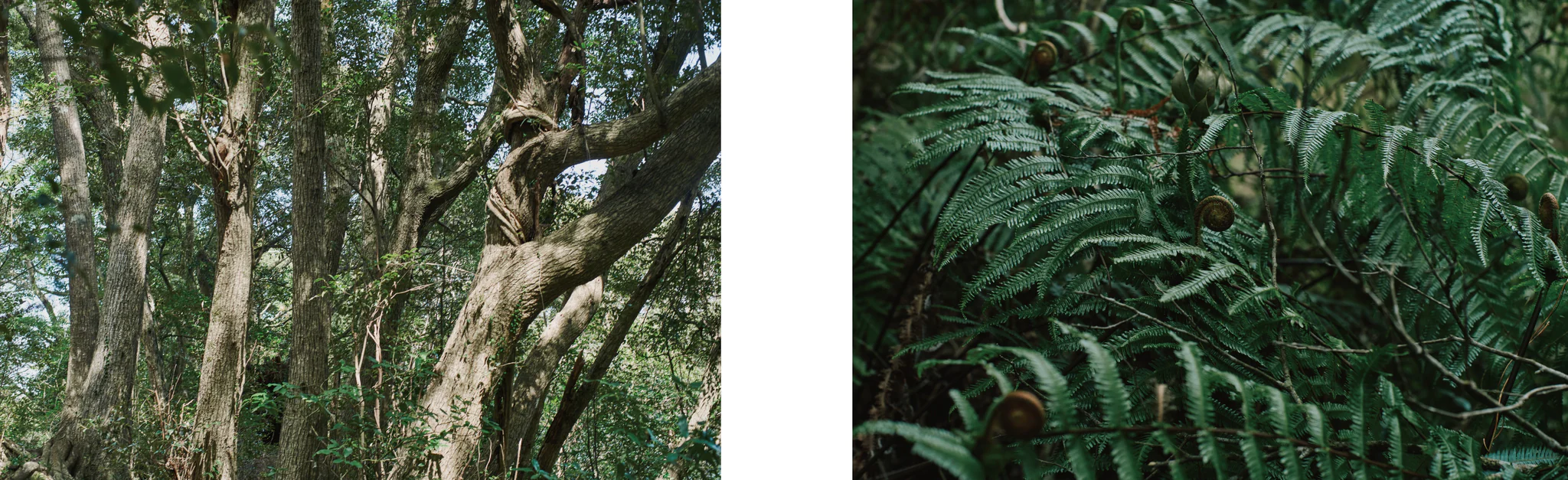 植生も豊かです。杉やヒノキなどの人工林のほかに、マテバシイ、スダジイなどのシイノキが多くて、シダ植物もちらほら。