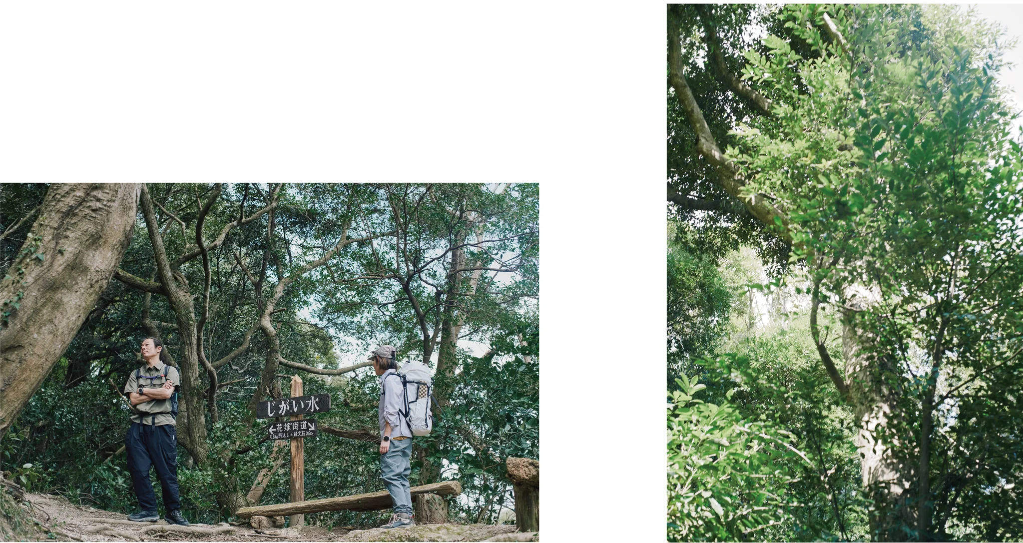 甲斐が指差す先には杉に絡みつくフウトウカズラというツル植物。甲斐がよく行く奥多摩や丹沢などの山とは植生がぜんぜん違うのでいろんなものが新鮮に映る様子。