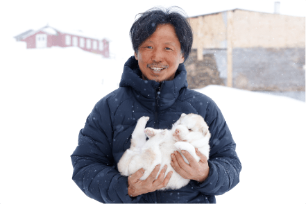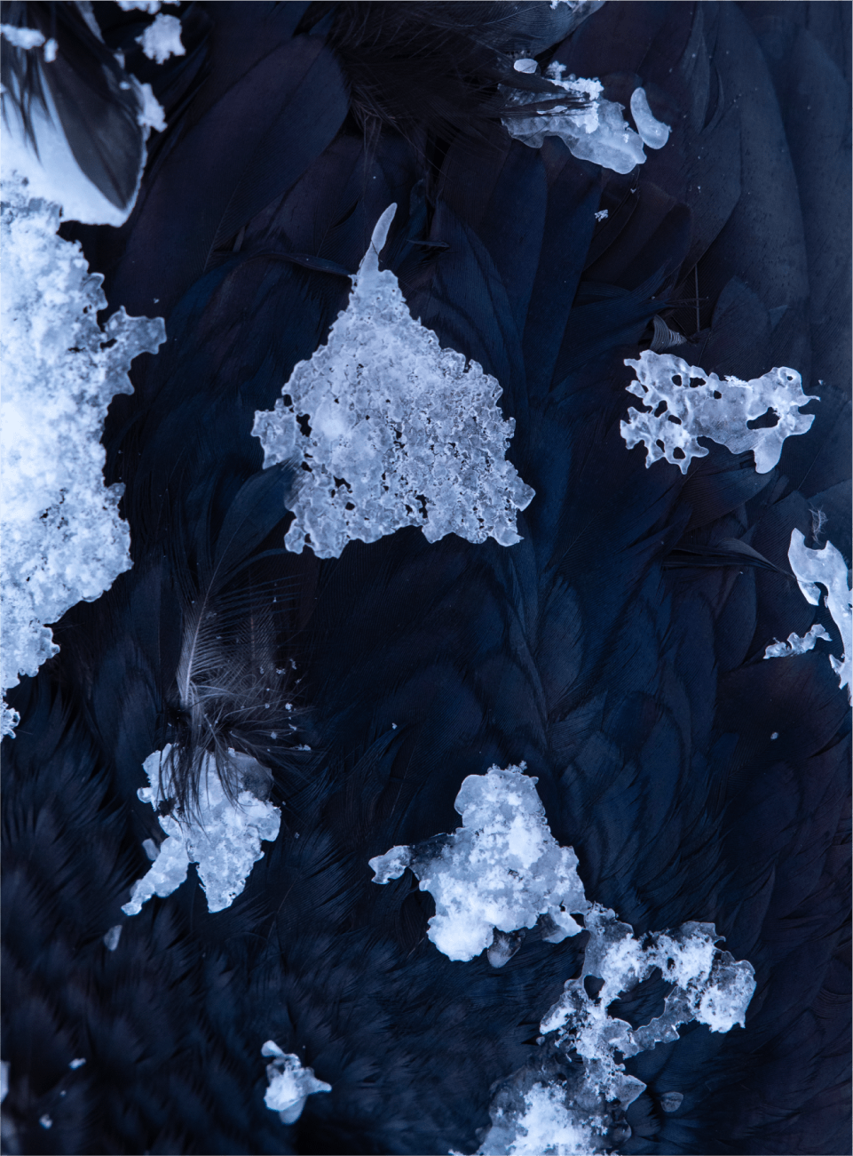 冬の間、食用に獲ったアザラシやセイウチなどの獲物は、狼に食べられないように櫓を組んで置いておきます。そこに鳥が吊るしてあり、その羽に、薄く氷が張ったのを撮った一枚。単純にデザインとして、ビジュアルとして、綺麗だなと感じて撮影しました。冷たさと命に対する厳しさみたいなものがあるんじゃないかな。