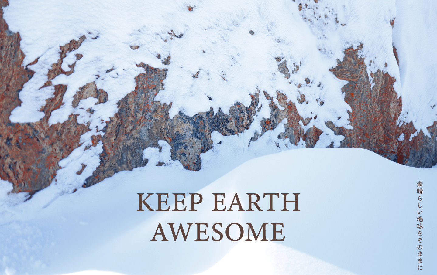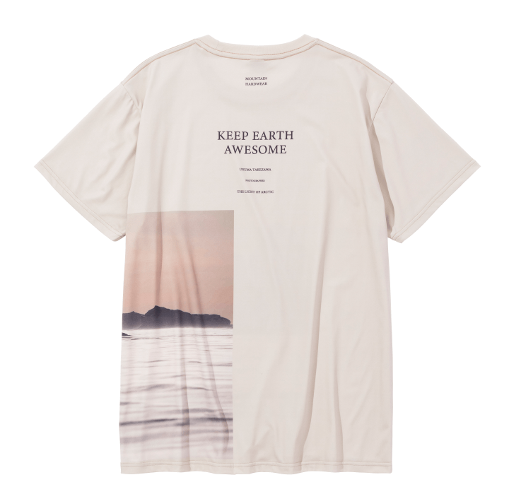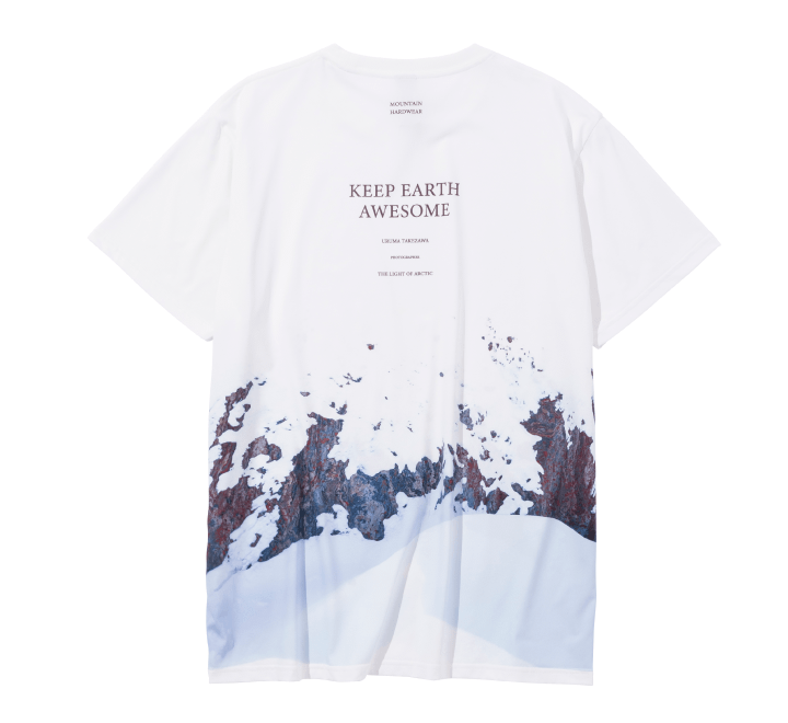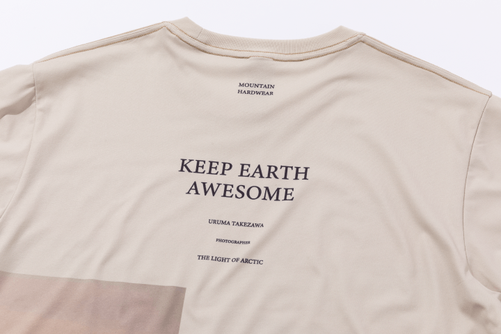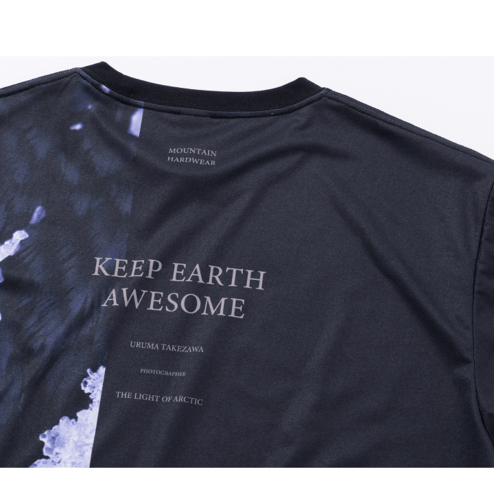竹沢うるま氏が北極を旅し、レンズに収めた自然の光とその移り変わりを精彩にプリントしたコラボレーションTシャツを製作しました。背面には「KEEP EARTH AWESOME (素晴らしい地球をそのままに)」のメッセージが施されています。