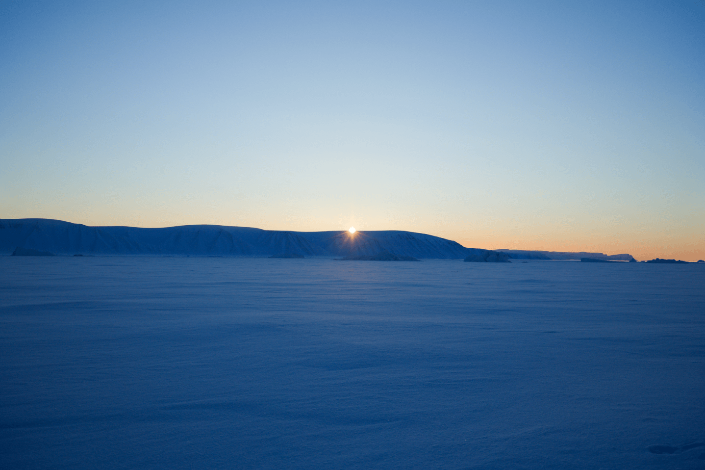 極夜が明けてすぐの夕景。日が傾くと、北極の空ってものすごく綺麗なんです。場所はカナック沖。島みたいに大きな氷の塊が、潮流の関係で集まってくる場所で、20~30mある氷山の1つを撮りました。じつは、こうした氷山の周りにシロクマが隠れていたりします。下は水っぽく見えるけど全て氷で、その上にすごい風が吹いて雪が舞い上がっている状態です。