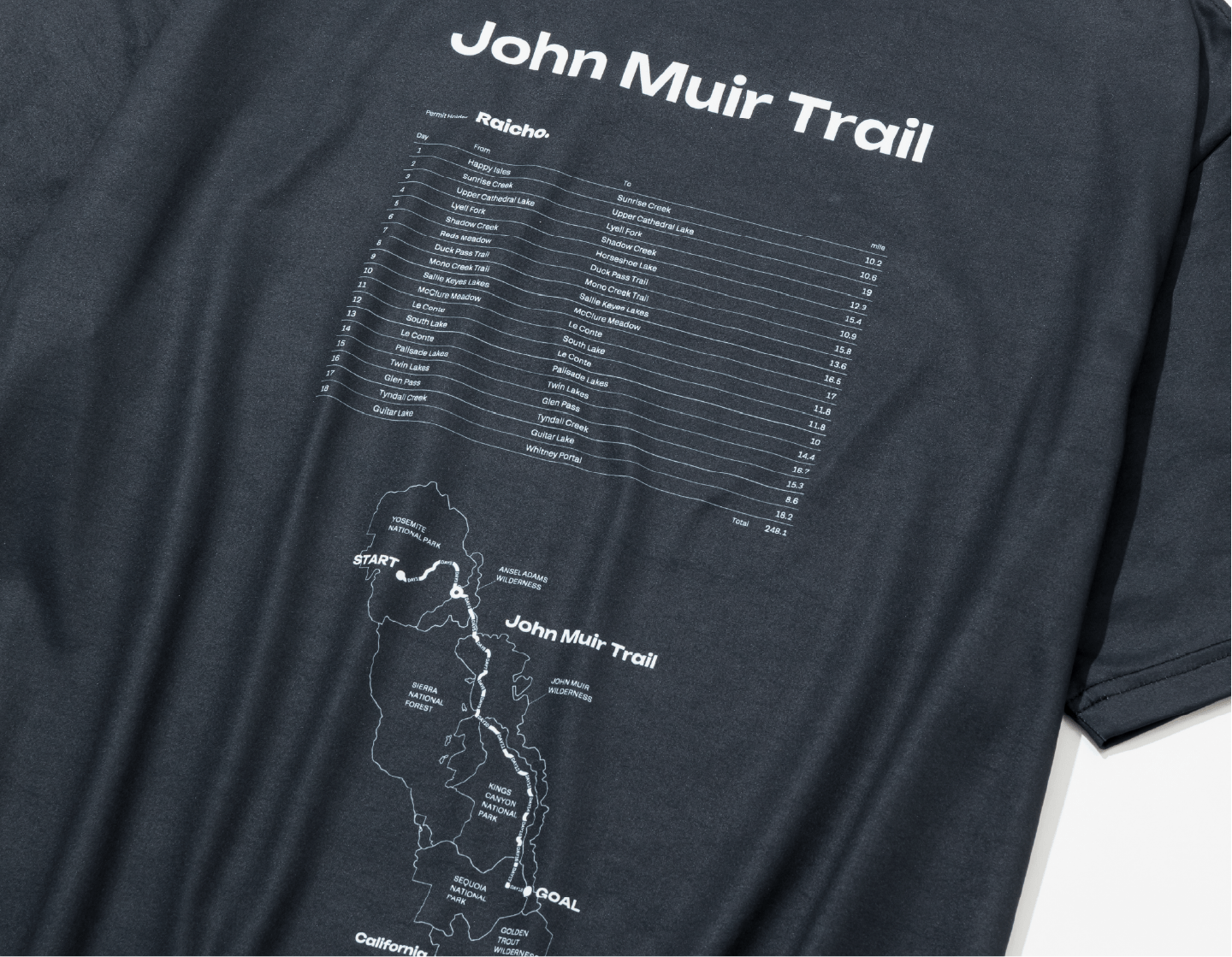 地球や環境の大切さを考え、美しい自然に感謝する日「アースデイ(4月22日)」をテーマに製作したTシャツ。Raicho inc.の3人がジョン・ミューアトレイルを歩いた際に感じた「自然の大切さ」「自然に還る」という思いを表現しました。バックプリントには彼らが歩いた軌跡や地図がデザインされています。生地はコットンライクのリサイクルポリエステル100%素材を採用。吸湿速乾性が高く、抗菌加工、遮熱効果も備え、幅広いアウトドアシーンに活躍します。