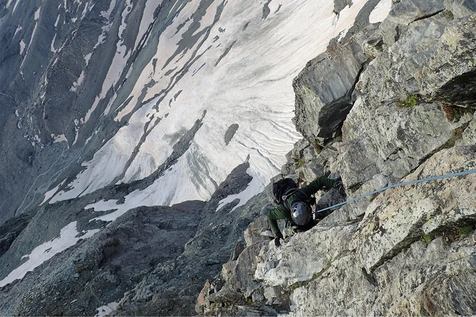特にモンブラン山群は粗い結晶系の岩なので、薄い生地のウェアは引っ掻き傷が付いてすぐに破けてしまいます。これは多少引っ掻いても安心感があって、1シーズン着続けても全く問題ありませんでした。クライミング中に着ていても動きに違和感を感じたことがないので、ストレッチ性に関しても優れていると感じています。
