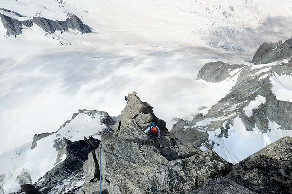 「下山時の朝、ちょうどグラン・クロワールというルンゼを渡り切ってすぐに大規模な落石がありました。岩陰で危なかったねなんて話をしている間も、尾根を乗っ越して飛んでくる石があるくらい規模が大きかった。その後、動き始めて数分後、1本下流にある別のルンゼが大崩壊してしまい、僕らの真上だったのですが、たまたま岩陰にいたので幸運にもやり過ごせた。岩雪崩自体は毎年起きていますが、ここまで危ないタイミングに当たってしまったのは初めての経験でした。
