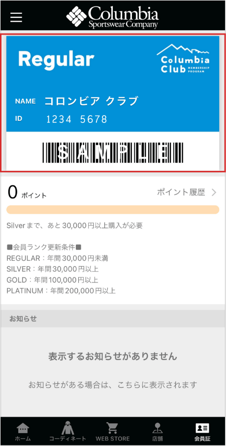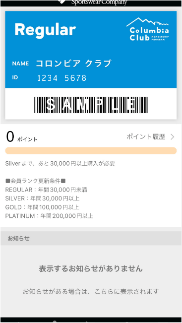 ログイン完了後は会員証画面に会員ID、バーコードが表示されます。