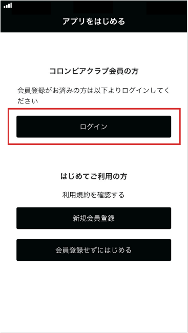 アプリをダウンロード後、「アプリをはじめる」画面にて「ログイン」をタップ。
