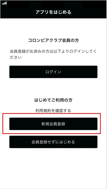 アプリをダウンロードした後「アプリをはじめる」画面で「新規会員登録」をタップ。※「会員登録せずにはじめる」をタップすると、仮会員としてアプリをご利用いただけます