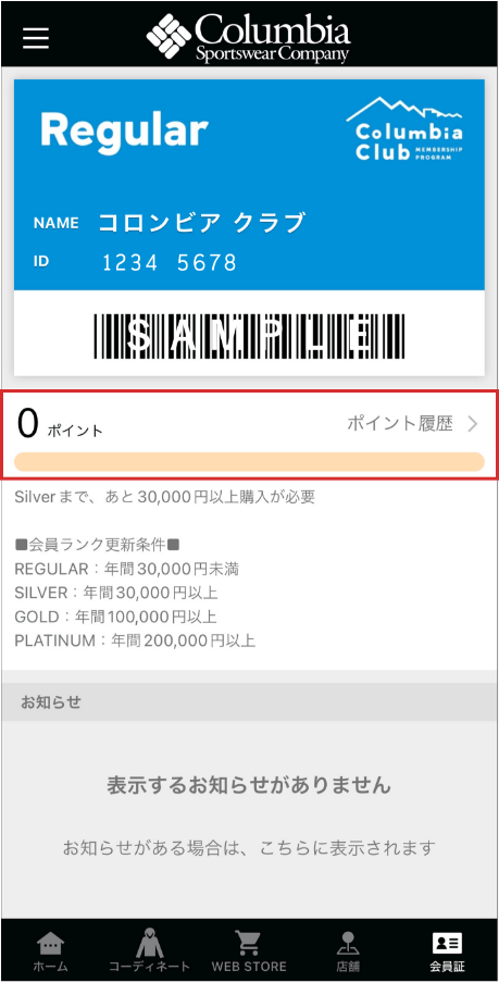 獲得したポイントはコロンビアクラブ店舗や公式オンラインストアで使えます。コロンビアクラブ店舗でご利用の場合はお会計時にポイント利用の旨をスタッフにお知らせください。