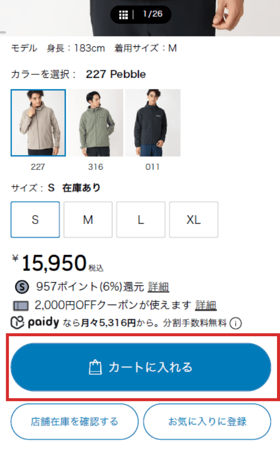 商品をお店で見たい、試着したい場合は、「商品ページ」の「カートに入れる」ボタン下にある【店舗在庫を確認する】をご利用ください。