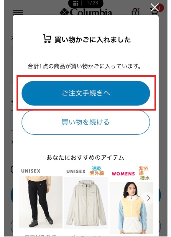 商品詳細ページにアクセスしてカラー、サイズを選択し、「カートに入れる」ボタンをクリックします。カートページで小計金額、商品がお買い物かごに入っているか確認します。