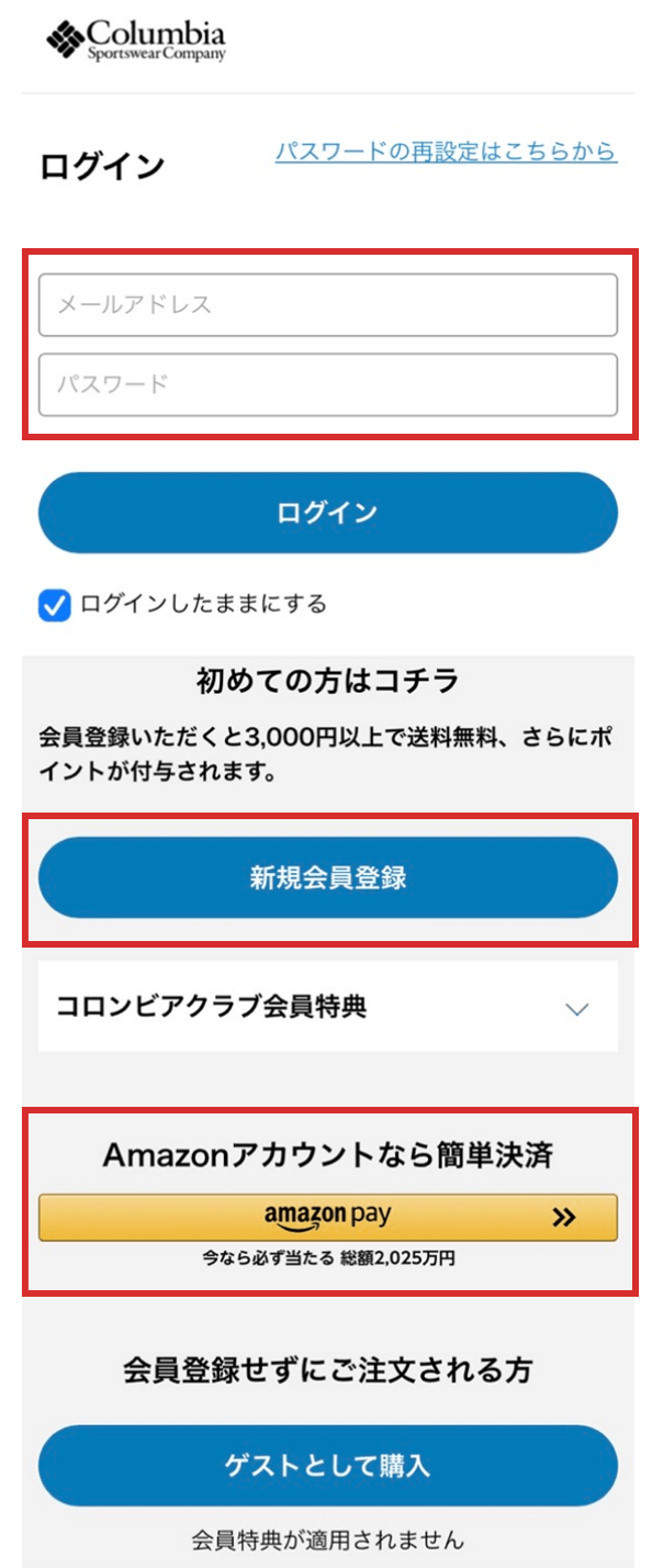 初めてご利用のお客様は「新規会員登録」から会員登録をしてください。Amazon会員アカウントでも購入可能です。登録がお済みの方は、「ログイン」から購入ステップに進んでください。