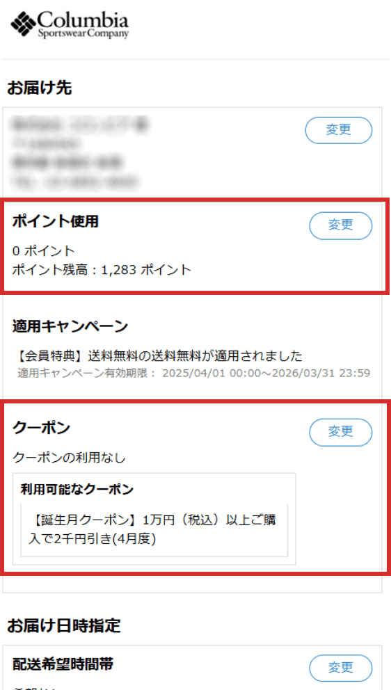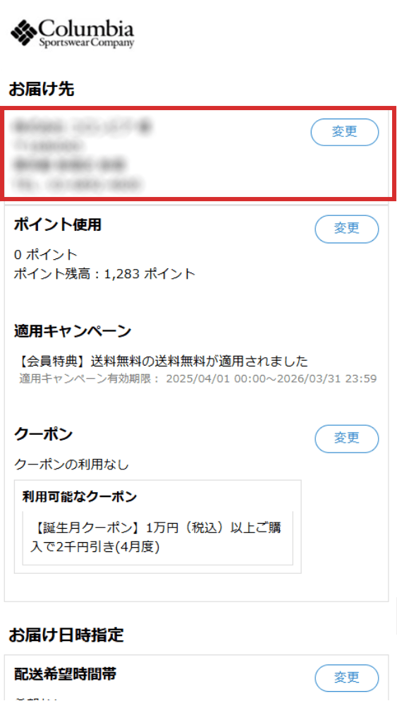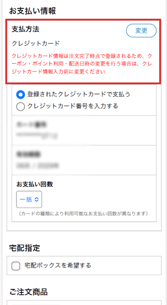 ご注文内容(お届け先、支払方法、注文商品)を確認します。お届け先、お支払情報、配送希望日等の変更がありましたら、「変更」ボタンを押してください。
