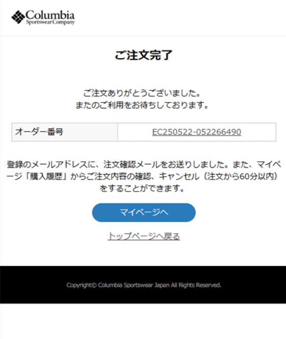 ご登録のメールアドレスへ注文番号を記載した「ご注文完了メール」が配信されます。