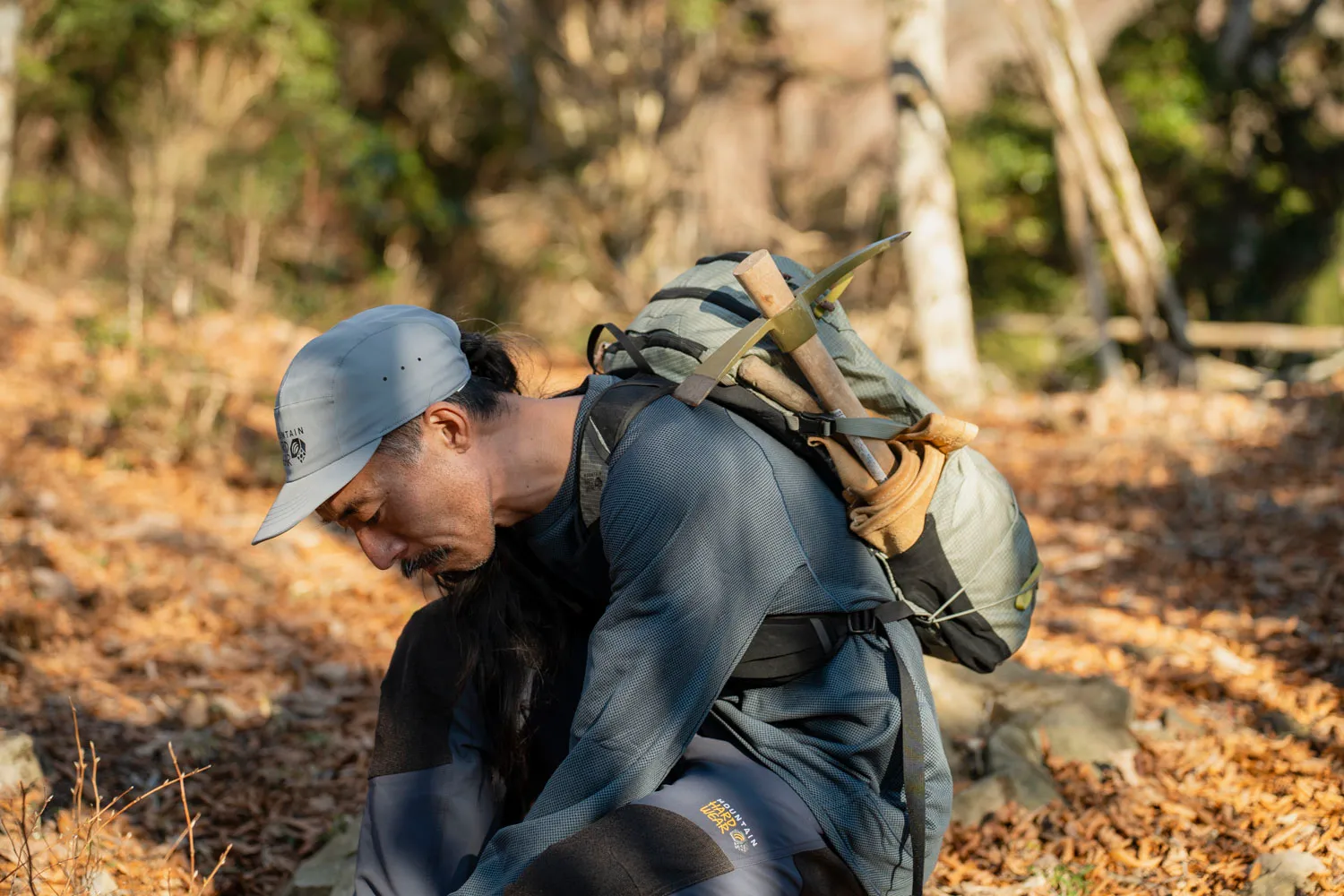 道普請の作業は多岐にわたる。山を登り稜線を歩き、土を掘り岩を運ぶ。草を刈ったり、倒木を切り倒すこともある。ときには過酷な自然環境で快適かつ安全に活動をつづけるためにも、MOUNTAIN HARDWEARのプロダクトの機能性が活きてくる。