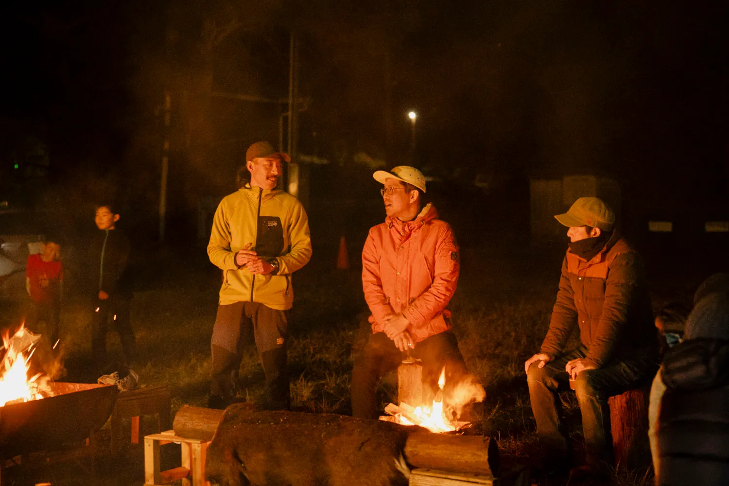 夜はキャンプファイヤーを囲み、意見交換を行った。林業や森づくりに携わる現場の声が参加者に届く貴重な機会。トレイルランニングをきっかけに、山を走るだけでは得ることのできない視点を知る場となった。